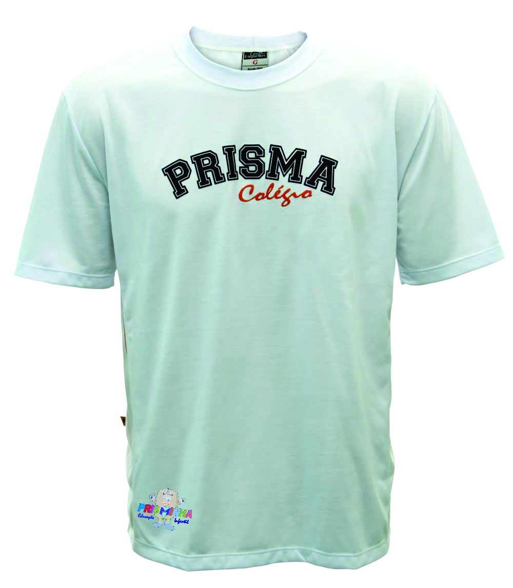 Camiseta manga curta, malha 67% poliéster + 33% viscose, cor branca com detalhes laranja e azul nas laterais, com estampa peito central.