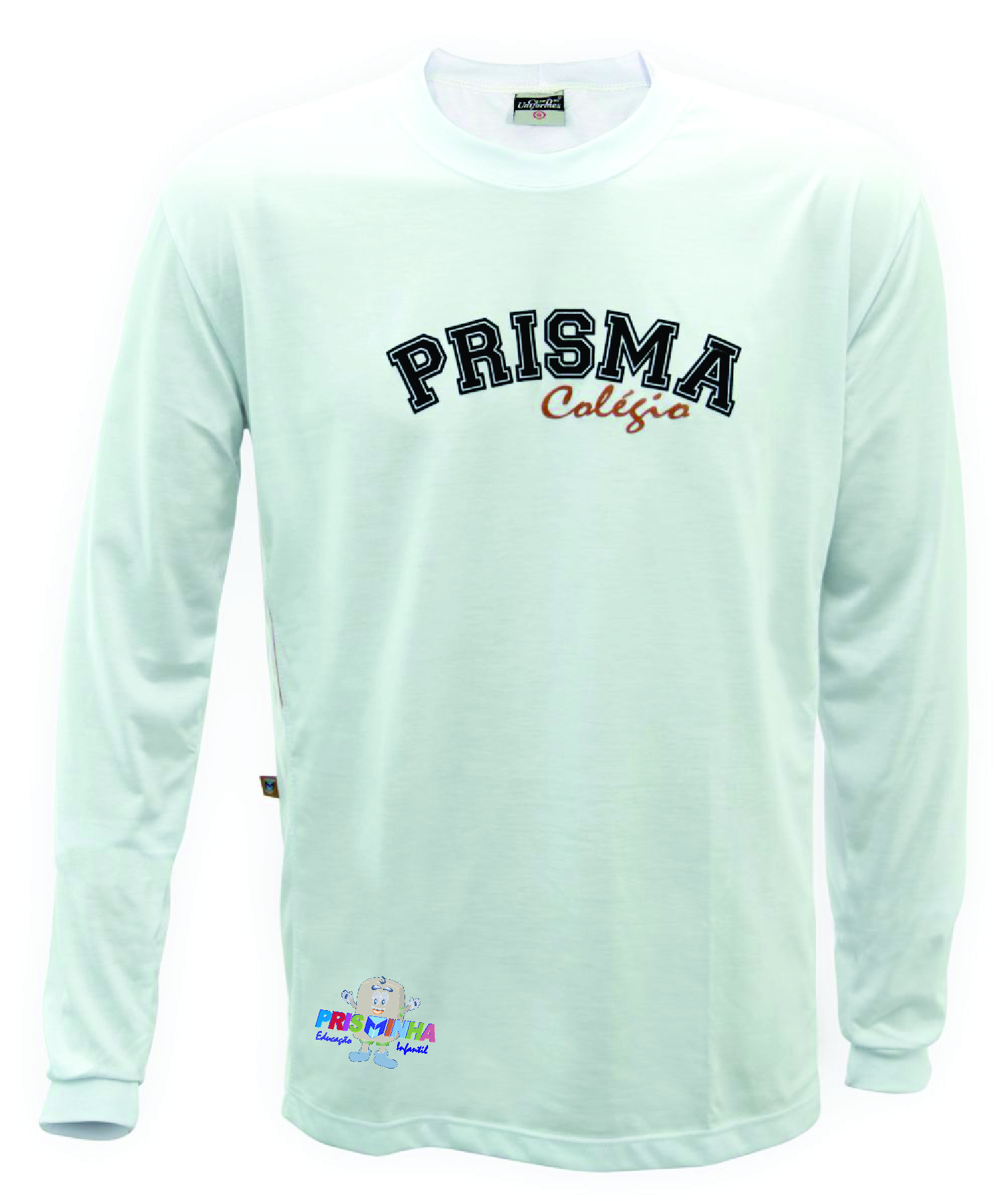 Camiseta UNISEX manga longa, malha 67% poliéster + 33% viscose, cor branca com detalhes laranja e azul nas laterais, com estampa peito central.